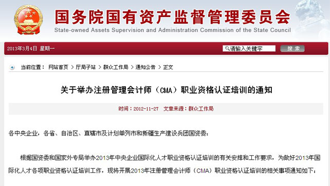 国资委关于举办2013年注册管理会计师(CMA)职业资格认证培训的通知